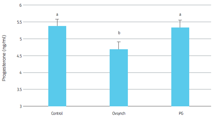 Serum progesterone concentrations of the pregnant heifers in the Ovsynch Group were lower (4.70 ± 0.17 ng/mL) than those found in the control (5.37 ± 0.08 ng/mL), or the PG (5.34 ± 0.13 ng/mL) groups (p < 0.001; Figure 1). There are reports that suggest that GnRH-based protocols are associated with low blood progesterone concentrations.23 Nevertheless, the lower levels of progesterone found for the Ovsynch group in this study fell within established values for early gestation in cattle(40, and did not have an impact on conception, pregnancy or fetal death rates.