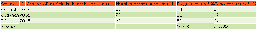 Conception (Control 50% Ovsynch 42% and PG 47%) and pregnancy (Control 36%, Ovsynch 31% and PG 30%) rates determined on day 28 post-AI, did not differ between groups (p > 0.05; Table 1).