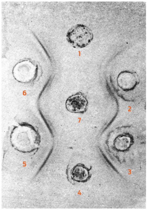Se utilizó la prueba de inmunodifusión en agar del tipo “Cuchterlony”8 empleando equipo Gelman para microtécnica y aplicando el diseño de precipitación descrito por Darbyshire.6