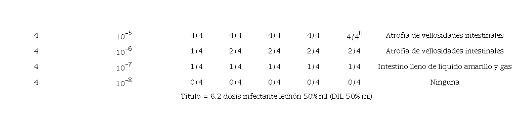 Dieciséis lechones de 7 días de edad se alojaron individualmente en unidades Horsffal durante 3 días y fueron alimentados con una dieta que sustituía a la leche materna (leche de vaca en polvo y dextrosa, esterilizados a 110 libras por 15 minutos). Al cuarto día los animales se dividieron al azar en cuatro grupos de cuatro lechones cada uno y fueron inoculados oralmente con las diluciones del virus 10−5 10−6 10−7 10−8 de la suspensión original del virus, proporcionando 1 ml por lechón.