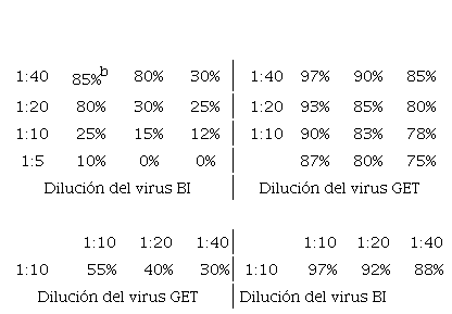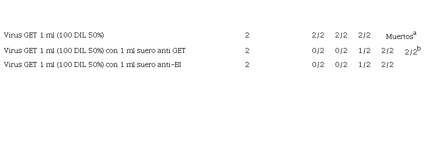 Para la evaluación de neutralización del virus de GET, con anticuerpos homólogos y heterólogos (anti-BI), se utilizaron lechones como indicador; tomando para todos cantidades constantes de virus (100 DIL 50%).