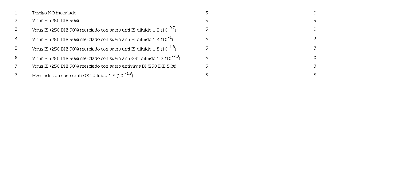 Siguiendo el método de seroneutrolización “virus constante, suero decreciente”;5 se prepararon las siguientes diluciones de ambos sueros 1:2 1:4 1:8, y se agregaron éstas a una suspensión de virus de bronquitis infecciosa titulado a 250 DIE 50% por ml. Las mezclas suero-virus se incubaron durante 30 minutos a 37 °C en la obscuridad y se inocularon a la dosis de 0.2 ml por embriones en 8 lotes de 5 embriones cada uno, quedando agrupados de la siguiente forma: