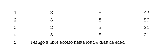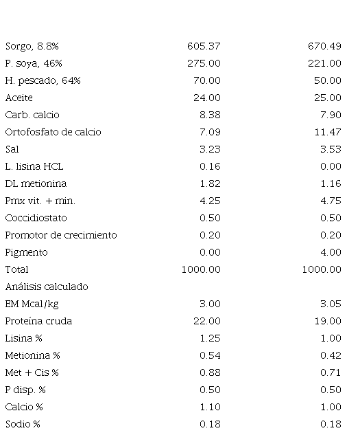 En el Cuadro 1 se muestran la composición de las dietas alimenticias, así como el análisis calculado. El alimento fue en harina, en dos etapas; iniciación, 1-28 días de edad; finalización, 29 a 56 días de edad.