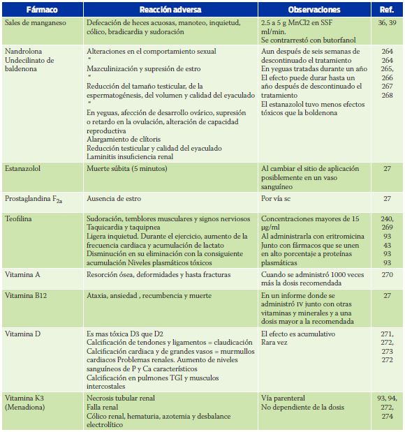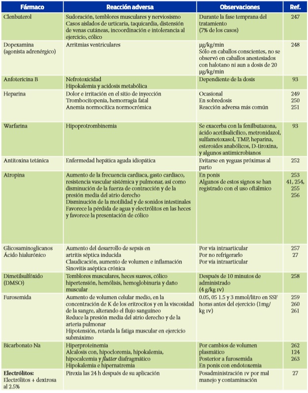 Dada la considerable variedad de fármacos que llegan a utilizarse en los caballos, así como la amplia gama de situaciones clínicas en las que éstos se aplican, las reacciones referidas pueden variar en intensidad, frecuencia e incluso forma. De tal suerte, el clínico deberá ponderar si una reacción determinada es debida o no al fármaco aplicado. Empero, el conocimiento en sí de que puede ocurrir una RA con el fármaco administrado, es de por sí una base necesaria para identificarla. A fin de presentar toda la información compilada, en el Cuadro 1247-274 se resumen algunas RA identificadas para otras familias farmacológicas no incluidas en el texto. La información vertida lleva la intención de ser completa incluyendo las reacciones menos comunes.
