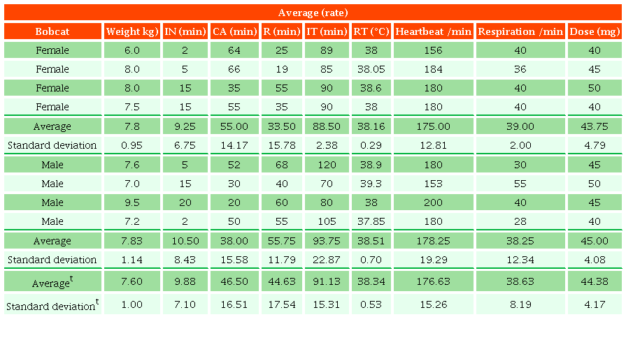 The average induction time was 9.8 minutes and the cataleptic state lasted for 46.5 minutes. Awakening was gradual and peaceful in all bobcats and occurred at an average of 44.6 minutes after catalepsy (Table 1).