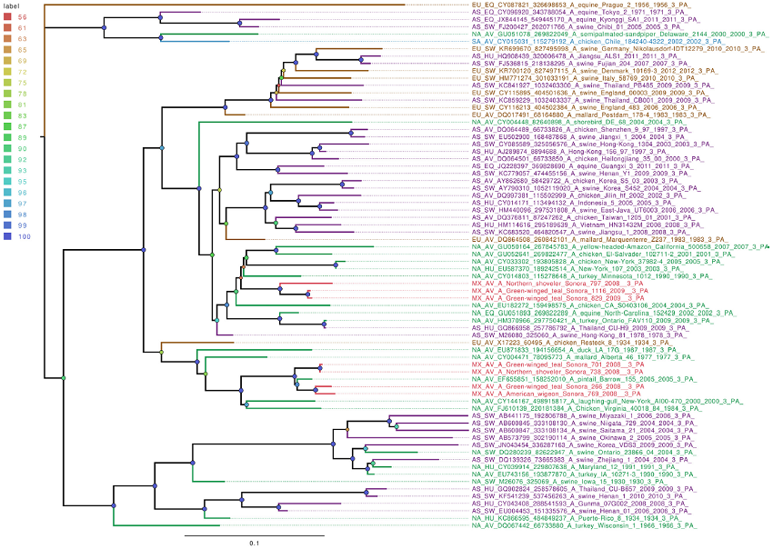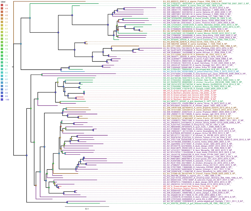 Phylogenetic analysis was performed separately for each influenza A segment, and in the case of the HA and NA segments, for each identified subtype. Included sequences were selected from four regions reflecting continents where avian species used in this study are observed: Europe (EU), North America (NA), South America (SA), and Asia (AS). Sequences from avian, human, equine and swine sources were selected from NCBI Influenza Virus Resource, and ones with identical nucleotide coding sequences were collapsed. Additionally, sequences with more than 20 consecutive N's were eliminated.