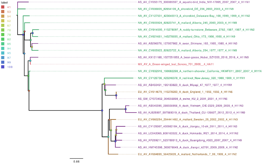 From the seven wild bird IAV-positive samples sequenced, five different hemagglutinin types were found (H5, H6, H9, H10, and H11), with the HA6 type being the only present more than once. Phylogenetic analyses of hemagglutinin gene segments showed that they are closely related to other IAV from North America (Figures S4 -S6 ). The exceptions were H6 and H11 segments, which were grouped closer to isolates from Asia (Figure 4 and 5). Interestingly, the 3 Mexican HA6 samples found in this study were grouped together despite being isolated in two different influenza seasons, from two distinct locations. Sample A/Green-winged teal/Mexico-Sonora/266/2008 H6N1, was collected during season 2007-2008, in Estero Tobari, and samples A/Northern shoveler/Mexico-Sonora/738/2008 H6N1, and A/Green-winged teal/Mexico-Sonora/829/2009 H6N5, were collected during 2008-2009 season, the first from Estero Tobari and the second sample from Laguna Moroncarit (Figure 4). However, sample A/Green winged teal/Mexico-Sonora/701/2008 localized close to the Asian sample described in 2016.