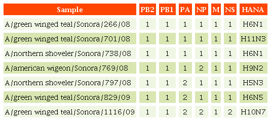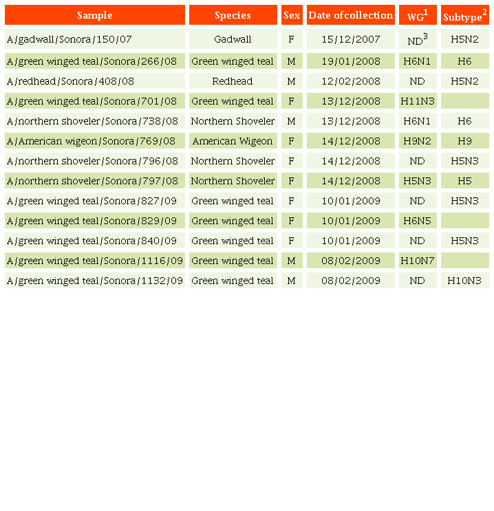 The samples from the 2008-2009 season were identified as H5N3 (A/Northern shoveler/Mexico-Sonora/796/2008; A/Northern shoveler/Mexico-Sonora/797/2008); A/Green winged teal/Mexico-Sonora/827/2008; A/Green winged teal/Mexico-Sonora/840/2008), H6N1 (A/Northern shoveler/Mexico-Sonora/738/ 2008), H6N5 (A/Green winged teal/Mexico-Sonora/829/2009), H9N2 (A/American wigeon/Mexico-Sonora/769/2008), H10N3 (A/Green winged teal/Mexico-Sonora/ 1132/2009), H10N7 (A/Green winged teal/Mexico-Sonora/1116/2009) and H11N3 (A/Green winged teal/Mexico-Sonora/701/2008).