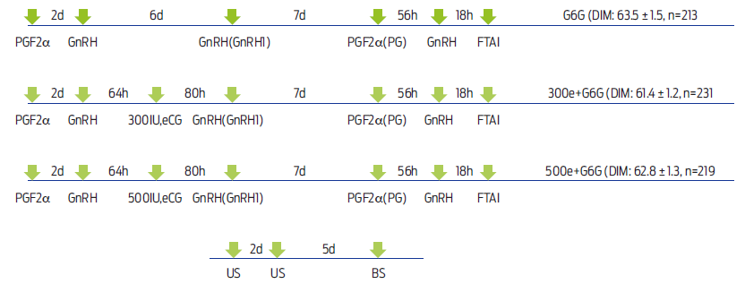 The dosage and analog of GnRH used in the recent study were 100 µg per injection of gonadorelin acetate. The dosage and analog of PGF2α used in the recent study were 500 µg per injection of cloprostenol sodium. The dosage and analog of eCG used in this study were 300 and 500 IU per injection equine chorionic gonadotropin. Two technicians performed the AIs of the cows and used two types of conventional semen.