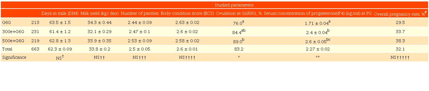 The cyclicity of the cows under study was confirmed on the basis of history or two consecutive ultrasonographic examinations of the ovaries, 10 days apart, which was started 2 weeks before implementation of the protocols to find a CL at least on an examination. The history was based on the detection of estrous with the aid of tail paint. Detection of estrous was performed 4 times per 24 hour period for 30 minutes (i.e., 6 hour intervals). Cows without complications, such as dystocia, retained placenta, clinical and puerperal metritis, lameness, clinical mastitis, respiratory, and digestive system diseases following the latter parturition were entered the study. The cows had free access to freshwater and were fed twice a day with a total mixed ration consisting of corn and alfalfa silages, hay as forage, soybean meal-based concentrate, vitamins, and minerals balanced to meet requirements for lactating dairy cows. The cows were housed in free stall barns with self-catching head-locks. Free stalls were bedded with mattress and straw. Fans were provided to alleviate the heat stress. We measured ambient temperature and relative humidity at 1-h intervals using ten thermograph devices (8613, B. S. 3231, Classell, London, UK). The termographs were placed in the middle of the barn, approximately 1.6 m above the feeding alley floor, making sure they did not contact the walls, they were protected from direct sunlight, and were placed at a sufficient distance (> 10 m) from recirculating fans. Twenty-four measurements were available for each thermograph for each day for calculating average daily temperatura and relative humidity. The following formula was applied to calculate daily average THI: THI = [1.8 × dry bulb temperature (Tdb) + 32] - [0.55 − 0.0055 × relative humidity (RH)] × [1.8 × Tdb - 26].40 The average maximum temperature during the months of the implementation of the experiment was 33.2 °C. Average of the temperature-humidity indices were calculated 79-86 during the experiment. The cows were milked twice daily. At the time of the onset of the treatments, the average of BCS for the cows was 2.6 ± 0.01 based on a 5-point scale.41 Cows were divided into two subgroups based on BCS as follows: ≤ 2.5 and > 2.5. At the time of the implementation of the experiments, 116, 132, and 137 cows had a BCS ≤ 2.5 in the G6G, 300e+G6G, and 500e+G6G treatment groups, respectively. The average milk production for the cows under study was 33.8 ± 0.2 kg/day on the day of artificial insemination (AI). In terms of milk yield (kg/day), on the day of AI, cows were divided into two subgroups: ≤ 34 and > 34. On the day of AI, 130, 120, and 125 cows produced ≤ 34 kg milk per day in the G6G, 300e+G6G, and 500e+G6G treatment groups, respectively. The mean number of parities for the study cows was 2.5 ± 0.05. According to the number of parities, cows were classified as primiparous and multiparous. In terms of the number of parities 61, 65, and 62 cows were primiparous in the G6G, 300e+G6G, and 500e+G6G protocols, respectively. The average of serum concentration of P4 (ng/mL) at PG was 2.27 ± 0.02 for the cows studied. From the viewpoint of serum concentration of P4 (ng/mL) at PG, cows were divided into two subgroups: ≤ 2.2 and > 2.2. At PG, 161, 120, and 94 cows had a serum concentration of P4 ≤ 2.2 (ng/mL) in the G6G, 300e+G6G, and 500e+G6G treatment groups, respectively. The study cows were inseminated 62 ± 5 days postpartum.
