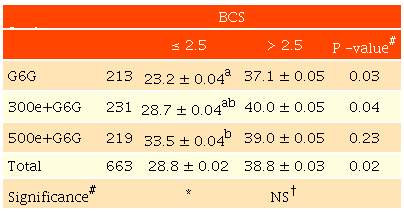 The effect of BCS on pregnancies per AI of cows following the implementation of G6G, 300e+G6G, and 500e+G6G protocols is shown in Table 2.