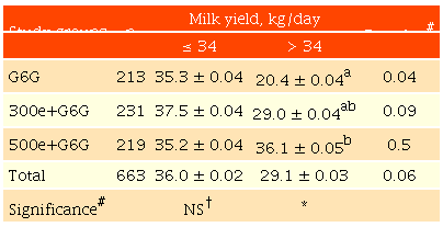 The effect of milk yield (kg/day) on pregnancies per AI of cows following the implementation of G6G, 300e+G6G, and 500e+G6G protocols is shown in Table 3.