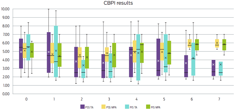 Considering PIS, treatment was a success in two animals in GT and two in GMPA; in GT from T1-T7 and in GMPA from T1-T5. Also, scores increased in the same proportion as PSS. When comparing the results for each time moment with T0 or between the groups, no significant differences were found. The overall CBPI score evolution can be observed in Figure 1.
