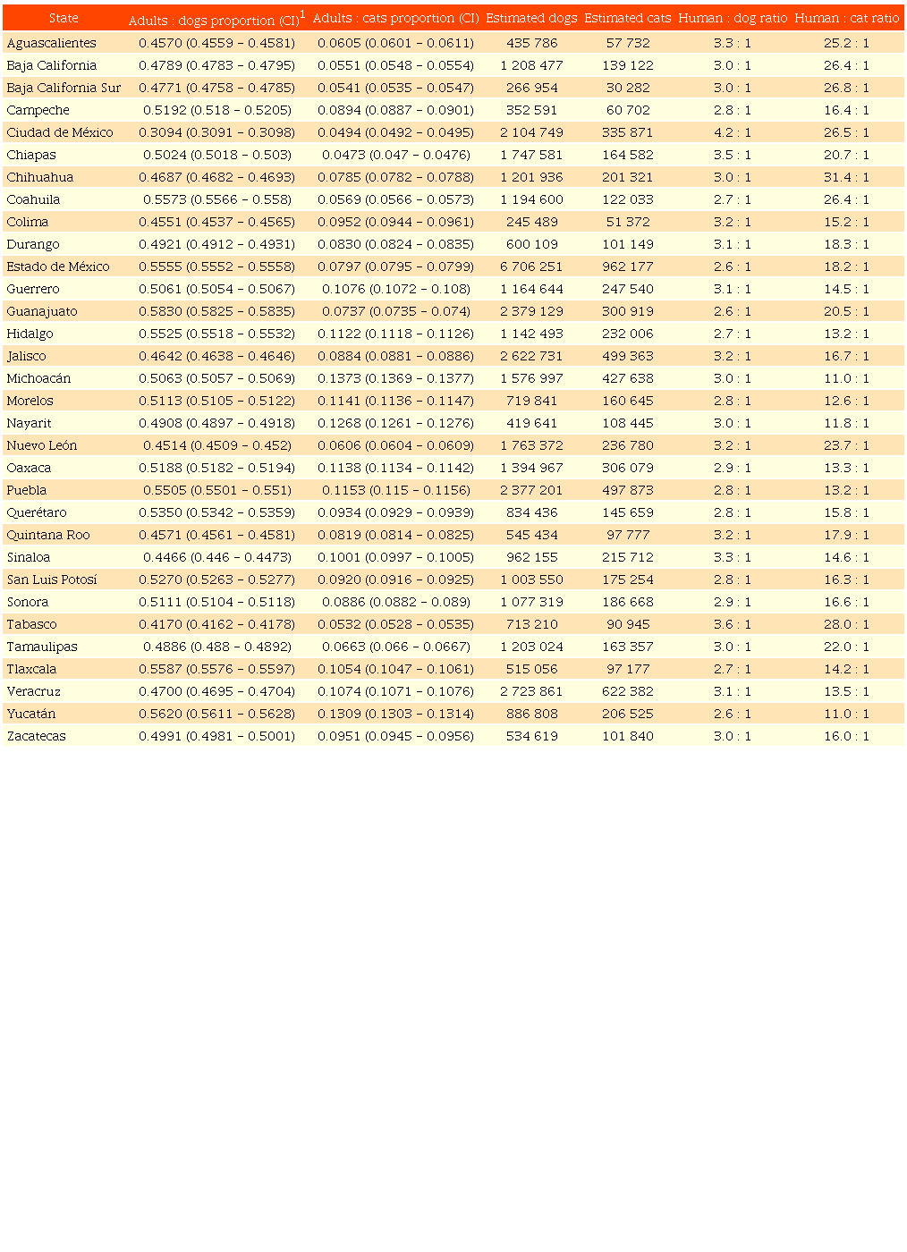 Considering the total population, Mexico’s human:dog ratio was 2.4:1, and the human:cat ratio was 17.6:1. The highest human:dog ratio of the 32 states corresponded to Ciudad de México with 4.2:1, while Estado de México, Guanajuato, and Yucatán have the lowest human:dog ratio (2.6:1). The highest human:cat ratio was estimated for Chihuahua, with 31.4:1, while that of Michoacán and Yucatán was the lowest (11:1) (Table 1).