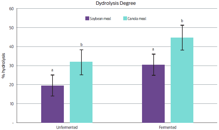 The evaluation of in vitro and in vivo digestibility of feed is an ideal method for determining the nutritional quality of feedstuffs.25 In this study, we observed that fermentation significantly increased (P < 0.05) the HD of soybean and canola meals by 12 % compared to that of their unfermented counterparts (Figure 1). These findings agree with previous research documenting the positive impact of fermentation on shrimp feed digestibility.25 This effect is attributed to the action of s cerevisiae enzymes (i.e., phosphatases and phytases) that reduce antinutritional factors during the fermentation process19, 35 increases the content of free amino acids in the feed36 and rises small peptides (< 15 kDa) through the cleavage of long-chain proteins, making protein hydrolysis more efficient.19
