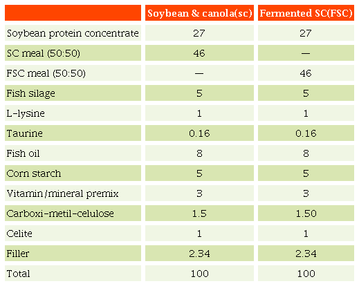Commercial soybean and canola meals were milled to particle size < 500 μm and then fermented using a modified method of Yabaya et al.21 soybean meal (2 kg), 60.5 mg of commercial dry yeast, Saccharomyces cerevisiae, with a cell density of 3x106 cells/g (Fermipan®Magidely®Mexport) and 1.1 L of distilled water (50 % humidity) were homogenized and incubated at 40 °C for 48 h. The yeast-fermented soybean meal was then dried at 70 °C and reground (< 500 μm). The same process was carried out for fermented canola meal. Fish silage was added to the formulation to maintain diet palatability. For that purpose, 10 kg of frozen fish heads cut into small pieces and ground to a homogeneous paste were used. Subsequently, 100 mL of hydrochloric acid (HCI) was added and homogenized manually ensuring good acid contact.22