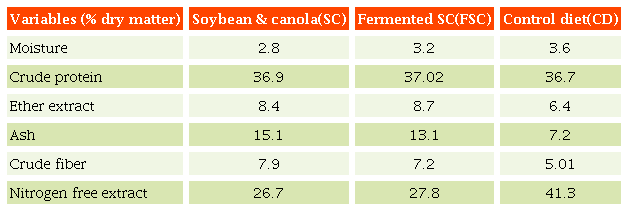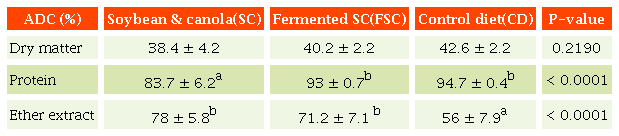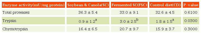 Apparently, the inclusion of vegetable protein sources did not affect the palatability of feed as there was no difference in apparent dry matter digestibility coefficients across treatments (Table 3; P = 0.2190). Moreover, the apparent digestibility coefficient for ether extract was higher in shrimp fed with plant meals, unfermented or not, compared to the control diet. However, the apparent digestibility coefficient for crude protein of shrimps fed unfermented vegetable meals was lower as compared to that of shrimp fed either FSC or CD (P > 0.05). These findings further confirmed the need to ferment plant meals to achieve digestibility coefficients comparable to those of fishmeal. The low apparent digestibility coefficient for crude protein of shrimps fed sc correlated with the low values for trypsin and chymotryp-sin activities observed in shrimp fed this diet. Taken together, our results showed the use of non-fermented soybean and canola meals decreased dietary protein digestibility in shrimp, and thus, are not appropriate for shrimp feeding.