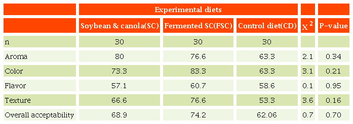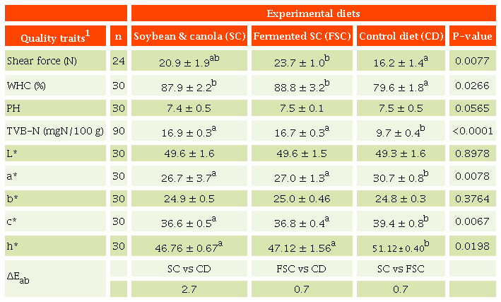 When significant differences were observed, means were discriminated using a Tukey HSD multiple range test. To confirm the homogeneity of variance and normality, we used the Levene's and the Shapiro-Wilk tests, respectively. For sensory evaluation, a Chi-Square test was performed to evaluate whether there was an association between dietary protein source and sensory attributes. All statistical analyses were performed using the STATISTICA software package (Dell Software). Differences were considered significant at P < 0.05.