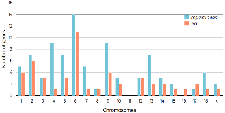 The inclusions of 5 or 10 % of AM in the diet caused higher DGE in L. dorsi muscle and liver, identified with down log2 fold change. It is considered that the liver plays an important role in the lipid metabolism of IMF.14 However, L. dorsi muscle also had a high number of DGE. This effect is observed in the decrease in IMF and in the changes in fatty acids of pigs fed the AM10 diet. In both tissues, higher DGE was identified in chromosomes 6 and 2 of pigs on AM5 and AM10 diets.