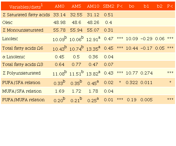 Feeding pigs before slaughter improved feed consumption when AM in the diet was included. This increased the daily consumption of metabolizable energy, oleic, linoleic and linolic fatty acids since AM contains a high amount of these monounsaturated and polyunsaturated fatty acids. However, the inclusion of 5 to 10 % AM in the diet showed a quadratic regression effect suggests a tendency to decrease as the inclusion of AM increases, which limits the increase in the levels of inclusion of AM in the diets. This could be due to the high content of tannins in AM that could have depressed feed consumption.11,26 Therefore, although the growth and carcass of pigs increased from 0 to 5 % AM the rate of improvement was less o declined when 10 % AM was fed. A different situation was found with diets rich in sunflower in Duroc pigs, where no effects on growth and fattening traits were found.3,4 However, sunflower affected the constitution of fatty acids with higher PUFA and the activation of the de novo lipid synthesis, as observed here in pigs fed AM.