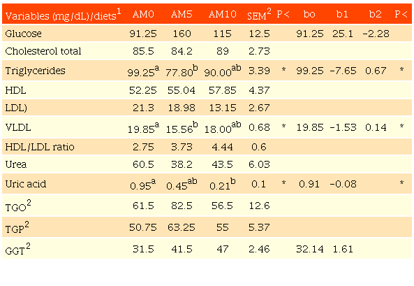 At slaughter, blood samples were obtained from pigs for biochemical assays, which were carried out using Byosistem A160 spectrophotometry equipment. Glucose (mg/dL). Lipid profile: Total cholesterol (mg/dL), triglycerides (mg/dL), HDL (high density cholesterol) (mg/dL), LDL (low density cholesterol) (mg/dL), VLDL (very low density cholesterol) (mg/dL) and HDL/LDL ratio. Liver profile: Urea (mg/dL), Uric acid (mg/dL), R A/G (Albumin/Globulin Ratio), TGO (oxalacetic glutamic transaminase) (mg/dL), TGP (pyruvic glutamic transaminase) (mg/dL) and GGT (gamma-glutamil transferase) (mg/dL) were also measured.