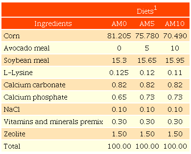 Twenty-four castrated Landrace-Yorkshire pigs with an initial weight of 55 ± 3 kg were used, housing one pig per pen with individual access to food and water. Pigs were fed ad libitum, according to the recommendations of the official Mexican animal welfare norm (NOM-062-ZOO-1999). After five days of adaptation to the diets, plus 56 days of experimental study, the pigs were sacrificed by a method approved by national regulation contained in NOM-033-SAG/ZOO-2014 (Lightheadedness followed by cutting of caval veins and brachiocephalic trunk), at an average live weight of 109 ± 4 kg. Eight pigs were assigned to each diet. The diets had 0, 5 and 10 % avocado meal (AM) (Tables 1, 2). The AM was obtained as described9 and the proximal chemical characteristics and fatty acid profile have been reported.11 Hass avocados discarded for human consumption due to their small size and/or physical damage were used in the diets. The fruits were stored at room temperature until they reached maturity. To obtain a homogeneous mixture of ripe and whole avocados (pulp, seed, and shell), the fruit was ground in a mobile hammer mill without a sieve, driven by a 5 HP gasoline engine. The fresh paste was stored at room temperature without additives, in plastic containers, and then, it was left at room temperature for four days until was dried. Then, the dry paste was ground again to incorporate it into the pig diets.