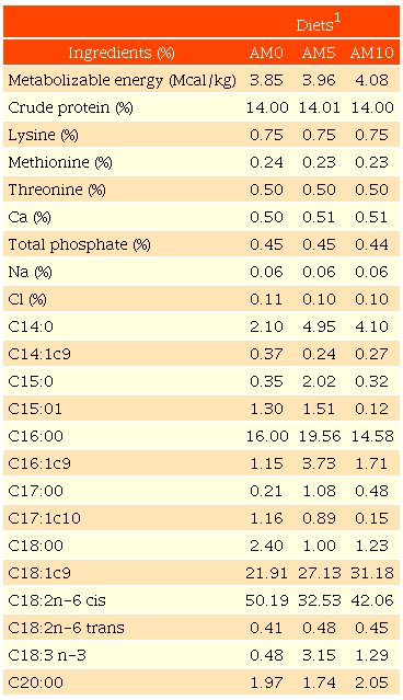 The pigs fed the AM10 diet had higher values of linoleic acid, total fatty acid Ω6, ∑ polyunsaturated fatty acids, PUFA/SFA and PUFA/MUFA, which is suggestive of a greater activation of the de novo lipid synthesis with this diet. Those traits had a positive linear regression effect, although the feed consumption was not linear. This trend indicates that the greater nutrient content in the AM10 vs AM5 diets (i.e. Mcal/kg ME, oleic, linoleic and arachidonic) influenced results, which is further supported by the fact that there is a greater amount of tocopherol and antioxidants in the AM.8,9 Therefore, it is reasonable to conclude that the profile of fatty acids in adipose tissue could be modified by the source of lipids since similar results for MUFA and PUFA were reported28 in pigs fed diets with 10 % sunflower oil, linseed oil, or a combination of fish oil-linseed.