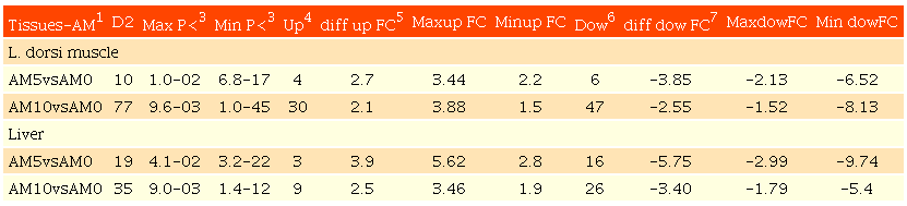 Tables 4 to 7 show higher DGE in L. dorsi muscle and liver when AM5 and AM10 diets were compared with the control diet. Higher DGE in AM10 was observed in the anatomical structure development and morphogenesis of L. dorsi muscle in, as was the effect identified in the biological processes: regulation of cellular component biogenesis and cell proliferation, regulation of the immune system process and system development, response to stress and cellular response, including lipid metabolism. With respect to the liver, AM5 and AM10 diets had higher DGE with down expression in anatomical structure development and morphogenesis. However, comparation of AM5 and AM0 diets, identified down DGE in liver biological process: Lipid metabolism, negative regulation of growth, response to stress and cellular response. AM10 and AM0 diets comparison showed down DGE for negative regulation of growth, regulation of cellular component biogenesis and cell proliferation, regulation of the immune system process and system development, response to external stimuli, response to stress and cellular response; in addition, to transport of fatty acids or hormones.