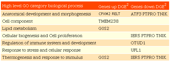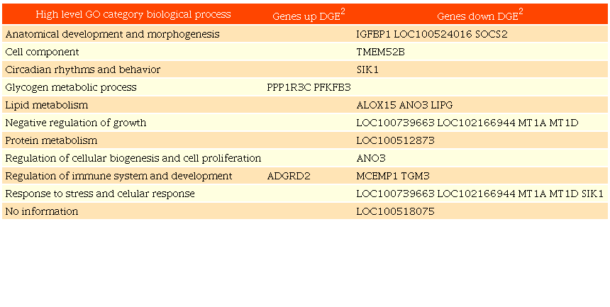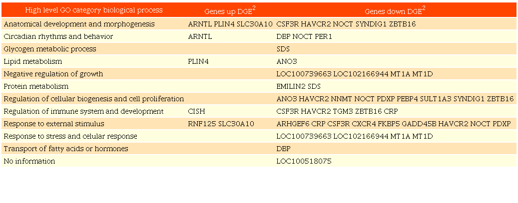 Eleven genes were identified with DGE in more than one comparison (Table 8). Stand out genes associated with biological processes related to growth, response to stress, lipid metabolism and circadian rhythms with down expression, most of them in the liver. The ARNTL gene was up expressed in both tissues evaluated in pigs fed the AM10 diet, associated with anatomical structure development and morphogenesis, as well as circadian rhythms of locomotor activity and behavior.