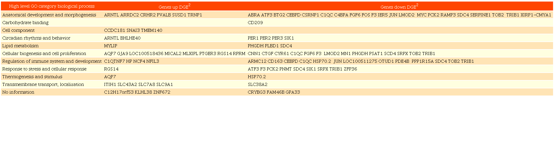 We found a down expression of the FOS gene in the Chinese Debao pig compared with Landrace, which influenced the pork quality between those breeds, being better for Debao pigs.18 The FOS gene, which is associated with the differentiation of adipocytes, in this work, had a down DGE in L. dorsi muscle (AM10 vs AM0 diet), as well as in the other 21 genes identified. The genes PER1, PER2, PER3, and SIK1 that are important for circadian rhythms of locomotor activity and behavior,19 showed down DGE in L. dorsi muscle for the AM10 diet vs AM0; and in the liver, the SIK1 gene (AM5 vs AM0), and PER1, NOCT, and DBP genes (AM10 vs AM0).