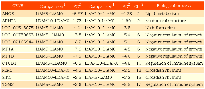 The ARNTL gene, which is associated with the circadian clock, had the opposite result: up DGE in L. dorsi muscle and liver for AM10 diet, but did not affect the circadian clock. In the pig muscle, nutrition modulates the circadian clock and those genes change their expression in response to nutrient intake.19 These authors reported that in pigs given food after fasting, the expression of ARNTL gene increased and the expression of PER1, PER2, PER3, SIK1 decreased. The ARNTL gene is a regulator of the circadian clock repressor genes PER1, PER2, and PER3, whose expression decreases due to environmental effects, while increasing that of repressor genes,20 which did not happen for AM10.
