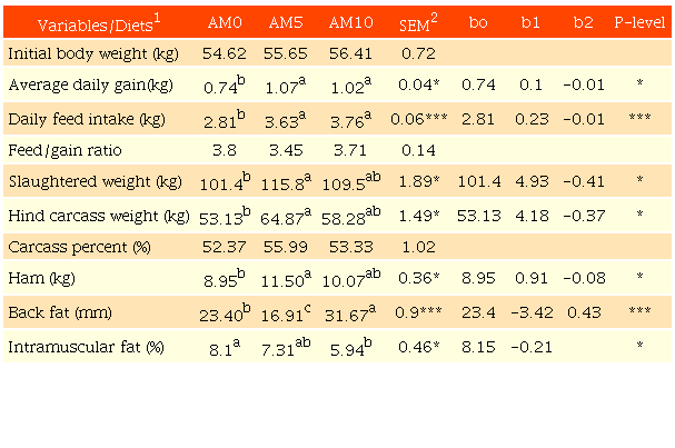 Feeding AM5 and AM10 increased the average daily gain, slaughtered body weight, hind carcass weight and ham; with higher back fat and lower IMF in L. dorsi in the AM10 diet. All these variables increased with dietary AM, with a significant quadratic regression effect, suggesting a tendency to decrease as the inclusion of AM increases; caused by the fact that the consumption of AM does not have a linear effect, which limits the nutrients available for growth. Our results for growth and carcass traits were higher than those reported for Yorkshire and Duroc,3,27 where a linear decrease in IMF was observed.