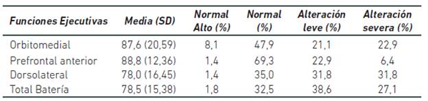 De acuerdo con el desempeño obtenido en el total de la prueba BANFE, el 65,7% de los estudiantes adolescentes presentan alteración entre leve y severa, lo que puede generarles dificultades para una adecuada transición hacia la adultez; tal como lo indican Blanco-Menéndez y Vera (2013), quienes señalan que para esta transición son importantes los procesos de control de las representaciones cognitivas, además, de la integración global de las diferentes funciones cognitivas emocionales.
