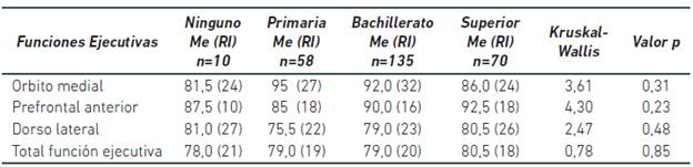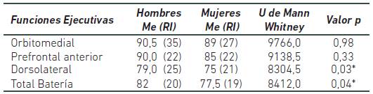 Al comparar el desempeño en la prueba BANFE según el sexo, se encontraron diferencias estadísticamente significativas en las medianas de las funciones dorsolaterales y en el total de la Batería entre hombres y mujeres, observándose un mejor desempeño en los hombres en todos las FE que evalúa el BANFE (Ver Tabla 2).