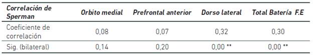Por otra parte, se encontró una correlación estadísticamente significativa entre el puntaje de las Pruebas Saber 11o, la función ejecutiva dorsolateral y el total de la Batería aplicada, sin embargo, se identificó que la correlación entre estas variables es baja (Ver Tabla 4).