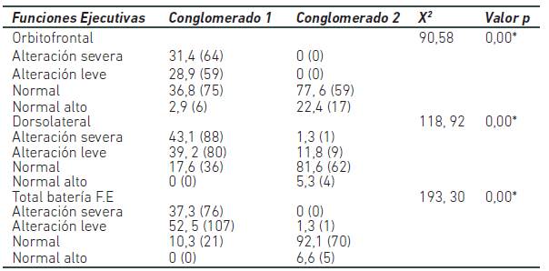 Mediante el análisis de conglomerados los estudiantes adolescentes que conforman la muestra del presente estudio se clasificaron en dos grupos, el primero contiene a quienes obtuvieron menor rendimiento en las pruebas orbitomediales, dorsolaterales y total de la FE, es decir, estudiantes que se caracterizan por ser impulsivos, con dificultades para planear, organizar la información y solucionar problemas, rígidos cognitivamente, con deficiencias en la memoria de trabajo y en los procesos de supervisión atencional. Por otra parte, el segundo grupo conformado por los estudiantes que se caracterizaron por un nivel adecuado de desarrollo de las FE esperadas para su edad y nivel de escolaridad, quienes muestran un buen nivel de manejo de la impulsividad, planeación y solución de problemas, una adecuada flexibilidad cognitiva, y suficiente manejo de memoria de trabajo y atención.