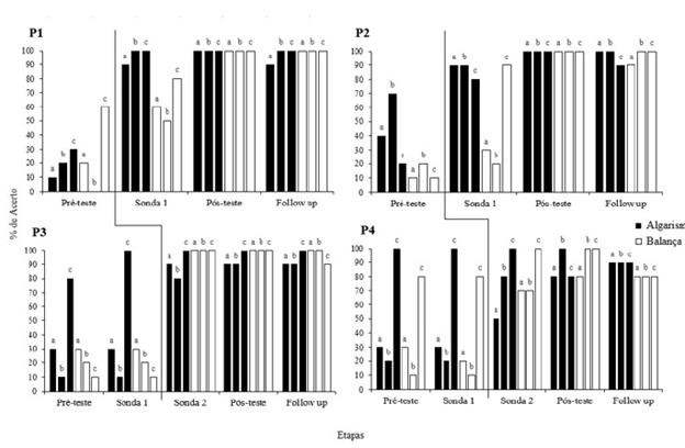A partir da observação do comportamento dos participantes P3 e P4 que permaneceram em linha de base enquanto outros participantes passavam pelo ensino, verifica-se que a mudança de comportamento ocorreu apenas após o início do ensino. Os participantes foram capazes, também, de descrever algoritmos para a resolução de problemas de adição com incógnitas nas posições a, b e c. Cabe ressaltar que as descrições de como os emparelhamentos deveriam ser realizados no início das fases de ensino, podem ter favorecido o cumprimento das tarefas pelos participantes.