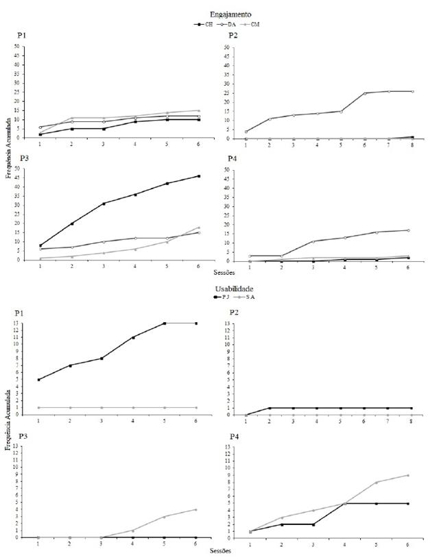 Quanto ao engajamento, o P1 emitiu comportamentos de comemorar em maior frequência, enquanto demonstrar aprovação foi a classe emitida com maior frequência por P2 e P4. O P3 foi o participante com maior ocorrência de comportamentos que indicam engajamento, emitindo 46 comentários sobre o enredo e 18 ocorrências do comportamento de comemorar. Apenas o P2 não emitiu o comportamento de comemorar. A respeito dos comentários sobre o enredo do jogo, cabe destacar que sete dos 10 comentários emitidos pelo P1 eram a respeito do caranguejo que "roubava" as peças, assim como o único comentário do P2 e um dos dois comentários do P4. Apenas o P3 comentou majoritariamente sobre outros aspectos da história do jogo que não o caranguejo. Observou-se a emissão de comportamentos de pelo menos uma das categorias que indicam bom engajamento até a última sessão para todos os participantes.