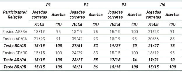 O número total de emparelhamentos necessários para atingir o critério de aprendizagem variou em razão da necessidade de repetição de jogadas decorrentes dos erros de cada participante. A Tabela 2 apresenta o número de acertos dentre o número total de emparelhamentos e as porcentagens de acertos dos participantes.