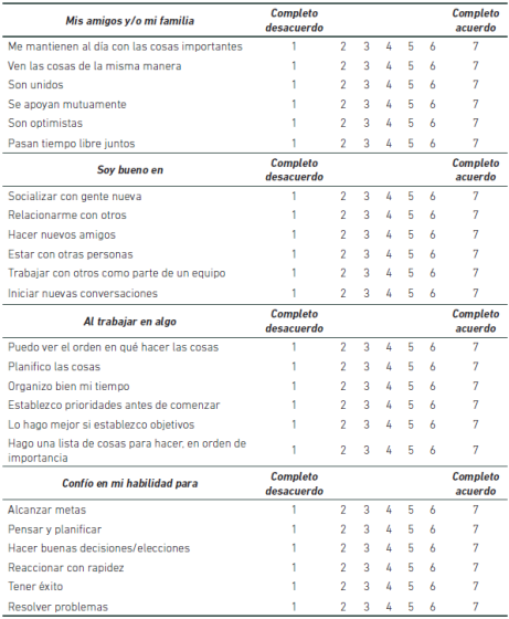 En segundo lugar, la adaptación al español muestra una estructura factorial coincidente a grandes rasgos con la del estudio original, con cuatro factores principales que se corresponden en su contenido con los propuestos por los autores en su estudio original. En el presente caso, el orden de los factores hace referencia a las habilidades sociales, el apoyo social de familia y amigos, la capacidad de planificación y la eficacia de metas. Se recomienda, para un análisis posterior, analizar si esta estructura factorial se confirma en un estudio que cuente con una muestra más amplia, de forma que los cuatro ejes se diferencien de forma nítida en lugar de las seis dimensiones que se muestran en el presente trabajo.