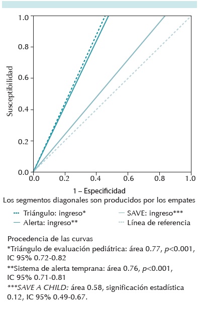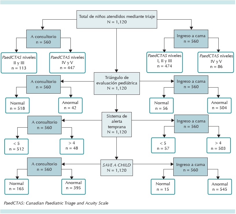 La adecuada categorización de los niños que requieren ingresar a una cama en urgencias (sensibilidad) y de aquellos que no lo requieren (especificidad) es un indicador del nivel de atención institucional y del rendimiento del equipo de salud.1,2 Se denomina triaje (término derivado del francés) al proceso de evaluación clínica preliminar que prioriza la atención de pacientes en función de su gravedad, previa a la evaluación diagnóstica y terapéutica en Urgencias Pediátricas.3 Para ello existen diversos métodos entre los que destacan The Canadian Paediatric E.D. Triage and Acuity Scale (PaedCTAS),4 los Sistemas de Alerta Temprana (SAT), Bedside Paediatric Early Warining System Score (PEWS)1,5-8 y SAVE A CHILD.9