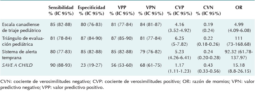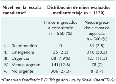 El proceso de evaluación en triaje permitió la selección de pacientes y asignación de un nivel de atención (I-V) de acuerdo con la gravedad de sus síntomas mediante la escala canadiense (estándar de referencia) que también correspondió al tiempo máximo de espera antes de completar su atención en el consultorio o en una cama de urgencias pediátricas.
