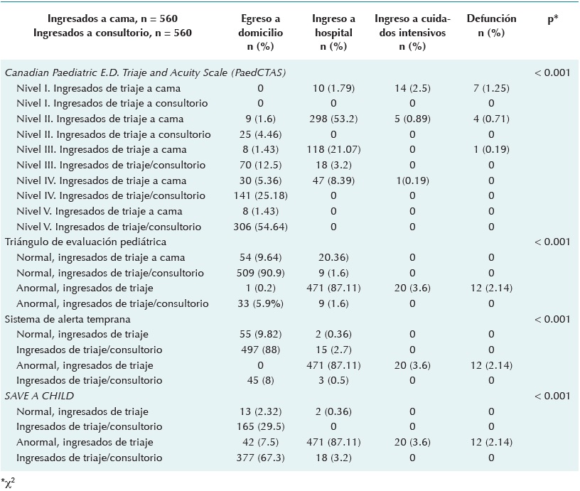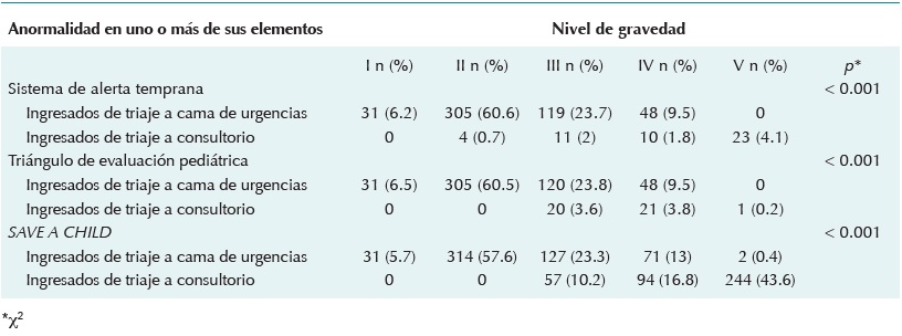 En el Cuadro 1 se muestra la distribución de frecuencias, por nivel de gravedad, de la escala canadiense: 482 (46.4%) fueron clasificados mediante triaje como estables y de éstos 167 (15.9%) sin anormalidad en las variables de los instrumentos utilizados. Se consideraron urgencias los niveles I a III de la escala canadiense y tanto ésta como los métodos restantes permitieron identificar inmediatamente a los niños con enfermedad grave amenazante para la vida (nivel 1) (Cuadro 2). De los 560 ingresados mediante triaje a una cama de urgencias 503 tuvieron cambios patológicos (referidos como anormalidades) en una o más variables del Sistema de alerta temprana, 504 en el Triángulo de evaluación pediátrica y 545 en SAVE A CHILD.