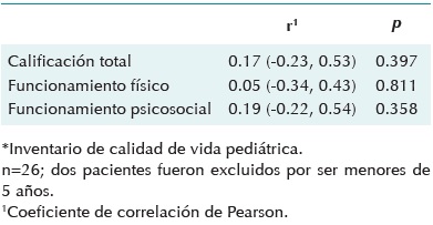 El promedio de calidad de vida para los pacientes fue de 74.1 (DE ± 13.8) y de 83.3 (DE ± 10.1) para los controles; esta diferencia de 9.2 puntos fue estadísticamente significativa (p = 0.005). El promedio del funcionamiento físico fue de 77.4 (DE ± 15.3) para los pacientes y de 85.2 (DE ± 9.9) para los controles, la diferencia fue de 7.8 puntos (p = 0.024). El promedio del funcionamiento psicosocial fue de 72.3 (DE ± 14.6) para los pacientes y de 82.2 (DE ± 11.2) para los controles, la diferencia (9.9 puntos) fue estadísticamente significativa (p = 0.004) (Cuadro 1). No se encontró correlación entre la percepción de los pacientes y la de los padres (Cuadros 2 y 3). De los 26 casos comparados se encontro que en 6, la persepción de la calidad de vida fue similar entre pacientes, en 10 casos fue mejor la percepción de los pacientes comparada con la de los padres y en los 10 restantes fue peor la percepción de los pacientes que la reportada por los padres.