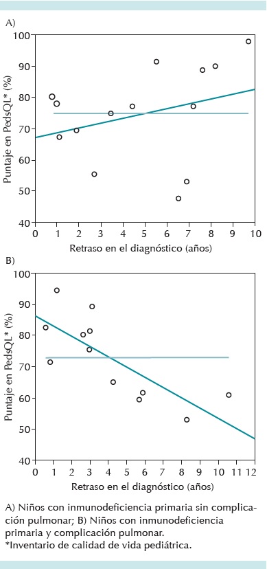 Asimismo, se encontró diferencia entre la calidad de vida en los pacientes con complicaciones pulmonares (bronquiectasias) y los que no las tenían. Como se podría esperar, la calidad de vida fue menor en el grupo con complicaciones; aunque esto no resultó estadísticamente significativo en nuestro estudio. No obstante, cuando buscamos interacciones entre el retraso en el diagnóstico, las bronquiectasias y la calidad de vida encontramos que esta última tiende a disminuir de forma clara y estadísticamente significativa en el grupo de pacientes con complicaciones pulmonares. Existió una disminución de 2.8 puntos porcentuales de la escala utilizada por cada año que se retrasó el diagnóstico; mientras que en el grupo de pacientes sin complicaciones no hubo una tendencia clara de disminución de la calidad de vida cuando se prolongaron los años de retraso en el diagnóstico. Este fenómeno se explica debido a que los pacientes sin complicaciones, gracias al tratamiento sustitutivo con gammaglobulina intravenosa, pueden volver a tener una vida casi normal a diferencia de los pacientes con bronquiectasias en quienes el tratamiento para mantenerlos libres de síntomas, infecciones y hospitalizaciones suele ser más complicado, lo que repercute en su calidad de vida.