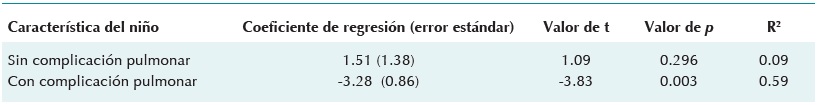 Se analizó la relación entre calidad de vida, años de retraso en el diagnóstico y presencia de complicaciones mediante un modelo lineal múltiple. Por el procedimiento de stepwise obtuvimos un modelo que consiste en las variables tiempo de retraso en el diagnóstico y presencia de complicaciones pulmonares; la interacción de estas dos fue marginalmente significativa (p = 0.054) (Figura 1). Como la interacción resultó significativa el modelo fue interpretado como dos modelos de regresión lineal simple en los que la variable de desenlace es el puntaje total de PedsQL y la variable independiente es tiempo de retraso en el diagnóstico en dos grupos de niños: uno con complicaciones pulmonares y otro sin ellas (Cuadro 4). En los niños sin complicación pulmonar no se observó asociación entre el tiempo de retraso del diagnóstico y el puntaje de PedsQL; sin embargo, en el caso de los niños con bronquiectasias hubo una asociación altamente significativa (p = 0.003) con el tiempo de retraso en el diagnóstico. De acuerdo con el modelo si un niño tiene una complicación pulmonar, cada año de retraso en el diagnóstico repercute en la disminución de 2.8 puntos porcentuales en su calidad de vida; mientras que si el niño no tiene complicación pulmonar el retraso en el diagnóstico no repercute en la puntuación del PedsQL de manera significativa (Figura 1).