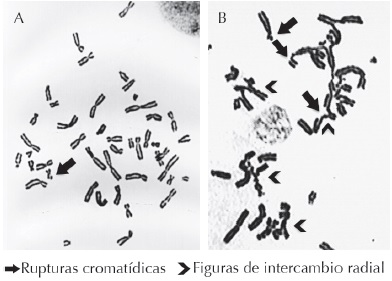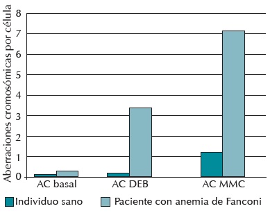 El estudio de diagnóstico clásico para la anemia de Fanconi, conocido como prueba de fragilidad cromosómica, se basa en la hipersensibilidad inherente de las células con anemia de Fanconi a los agentes que ocasionan enlaces covalentes cruzados en el ADN como la mitomicina-C o el diepoxibutano. Consiste en contabilizar, en los cromosomas de los pacientes, las rupturas espontáneas y las inducidas cuando sus células son expuestas a mitomicina-C o diepoxibutano y compararlas contra un control normal y un control positivo a AF para asegurar la actividad apropiada de la mitomicina-C o el diepoxibutano (generalmente una línea celular de anemia de Fanconi). A partir de esto se identifica el número de rupturas por célula y la proporción de células con rupturas.4 Un paciente con anemia de Fanconi mostrará un aumento significativo de rupturas con respecto al control, sobre todo en las células con daño inducido (Figura 1) en cuyos cromosomas se detectan, principalmente, rupturas de tipo cromatídico y figuras de intercambio radial (Figura 2).7