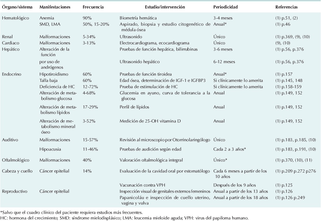 La anemia de Fanconi es una enfermedad multisistémica, compleja y cuya cronicidad genera importante estrés psicosocial. Aunque generalmente se dejan al cuidado de un hematólogo los pacientes se benefician de una atención multidisciplinaria en la que participan diversos especialistas y grupos de apoyo. La asociación civil llamada Fondo para la investigación en anemia de Fanconi (Fanconi Anemia Research Fund) reúne periódicamente, en el marco de una conferencia, a médicos con amplia experiencia en el tratamiento de pacientes con anemia de Fanconi para discutir y consensar recomendaciones para el diagnóstico y cuidado de los pacientes. La versión más reciente de las guías para el cuidado clínico de los pacientes con anemia de Fanconi se publicó en 2014.1 El cuadro que se presenta resalta algunos de los puntos clave en su seguimiento pero se recomienda considerar cada caso de manera particular (Cuadro 1).