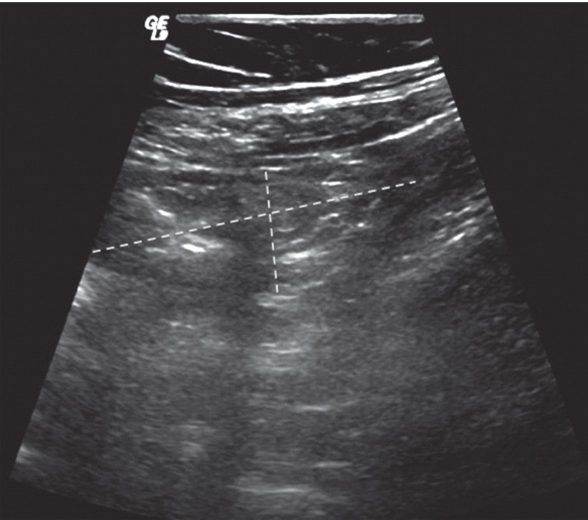 Masa ovalada que mide 5 ´ 2 cm en sus ejes mayores, ubicada en flanco derecho en íntimo contacto con la pared abdominal de aspecto heterogéneo, con centro ecogénico.