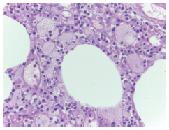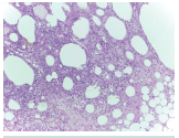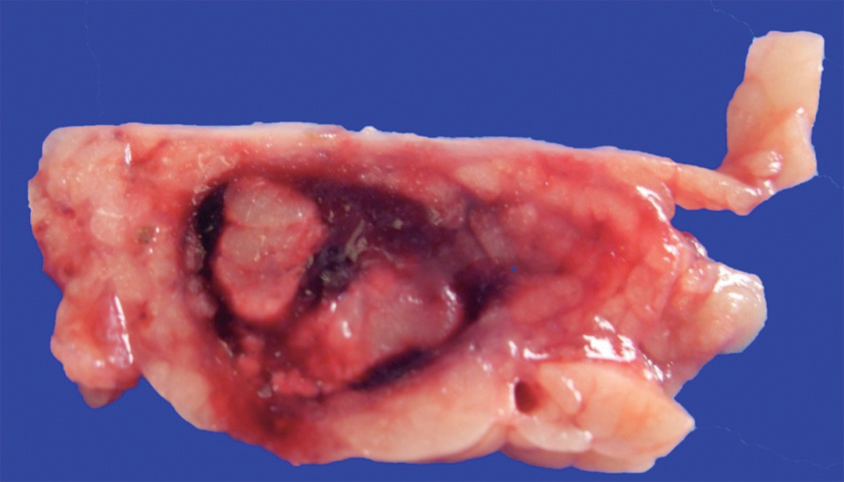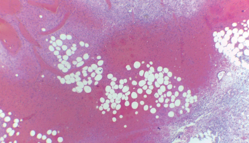 Los cortes histológicos muestran tejido graso maduro con extensas áreas de hemorragia rodeadas de infiltrado inflamatorio